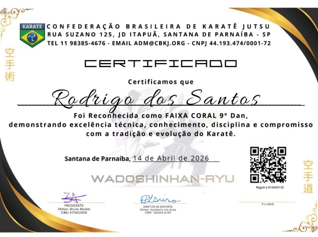 Graduação reconhecida pela CBKJ como expressão de excelência técnica, conhecimento, disciplina e compromisso com a evolução do Karatê Jutsu.