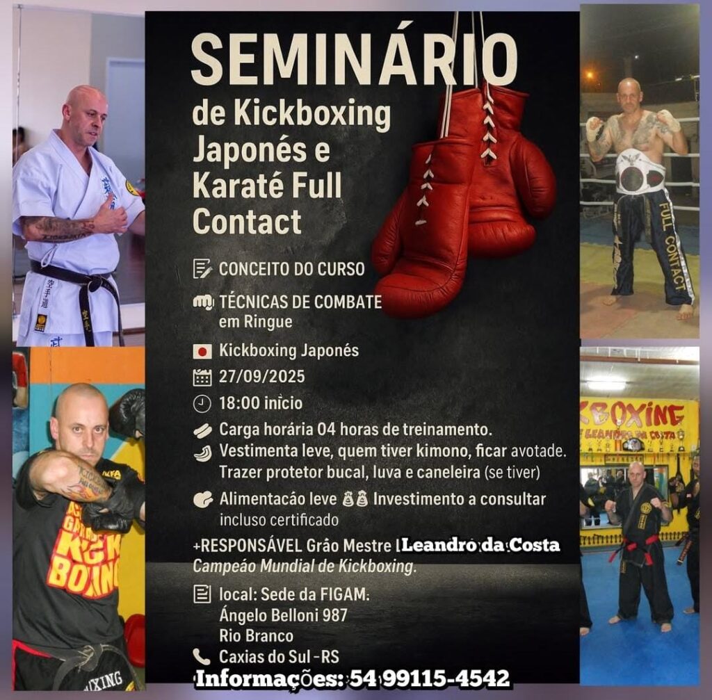 No dia 27 de setembro de 2025, Caxias do Sul será palco de um grande encontro de artes marciais: o Seminário de Kickboxing Japonês e Karatê Full Contact, ministrado pelo Grão Mestre Leandro da Costa, campeão mundial de Kickboxing. O evento acontecerá na sede da FIGAM, localizada na Rua Ângelo Belloni, 987, bairro Rio Branco, com início às 18h e carga horária de quatro horas intensivas de treinamento.